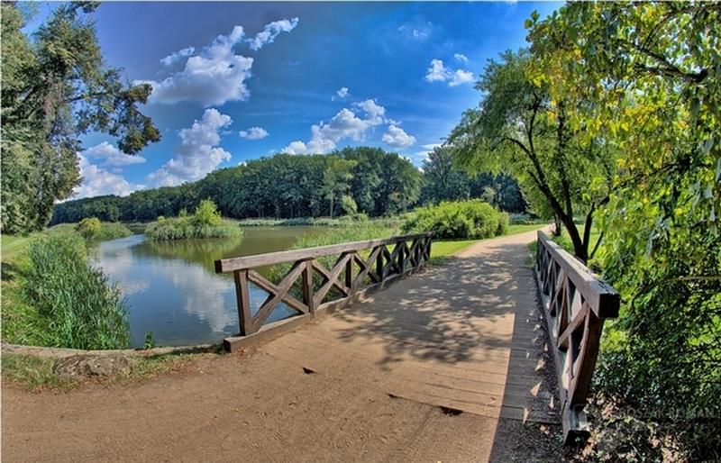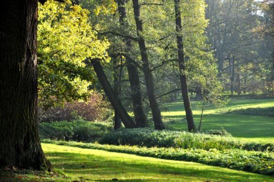Malowniczy, zaprojektowany w stylu angielskim park, wzdłuż kilku stawów na rzece Trzemnej.